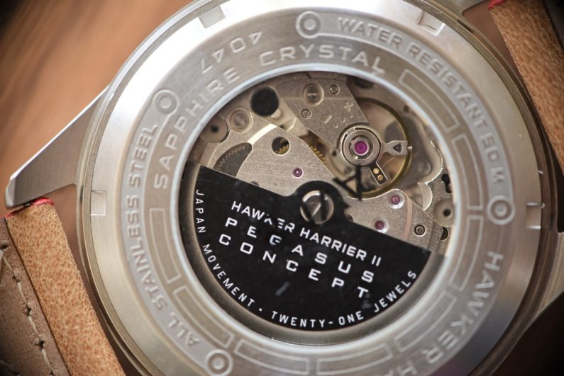 Pour rester dans les codes aéronautiques de la marque, c’est la silhouette du Harrier II (ou AV-8B Harrier II dans sa dénomination américaine, référence encore plus proche de la marque de montre) qui sépare les disques. S’agissant d’une silhouette de face, seuls les regards les plus avisés reconnaîtront un avion, et c’est au final assez sobre, l’angle des ailes pouvant aussi rappeler la forme de la masse oscillante d’une montre automatique. C’est propre et original, sans être dans le rappel trop présent au monde aérien.