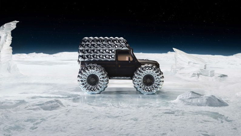 Le Classe G de Mercedes est devenu une véritable icône que les créatifs s’amusent à personnaliser. Pour son événement Moncler Genius lors de la fashion week de Londres, la marque de doudounes autrefois française s’est alliée aux designers de Mercedes pour concevoir ce qui doit être le plus impossible à faire rouler des Classe G (ce concept n’est pas prévu pour ça), avec ses pneus oversize et toute sa partie arrière en doudoune.